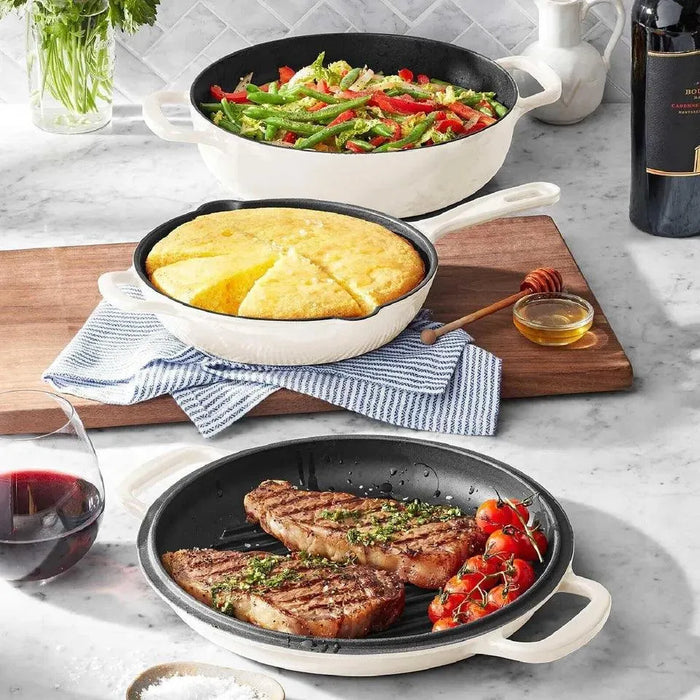 • Set includes a 9" skillet, 4-quart 2-in-1 grill, and cocotte.