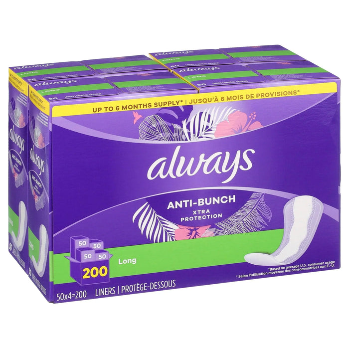 Always Anti-Bunch Xtra Protection Daily Liners, Long, Unscented (200 Count)